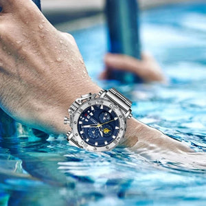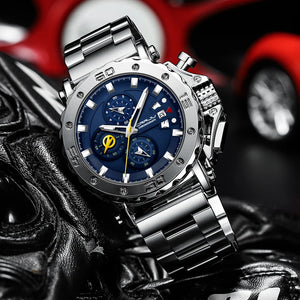 This magnificent wrist watch features a generous chronograph display with luminous analog pointers showing time in a surreal fashion. In addition, the majestic round tachymeter bezel and lustrous metal strap look fabulous on the wrist.