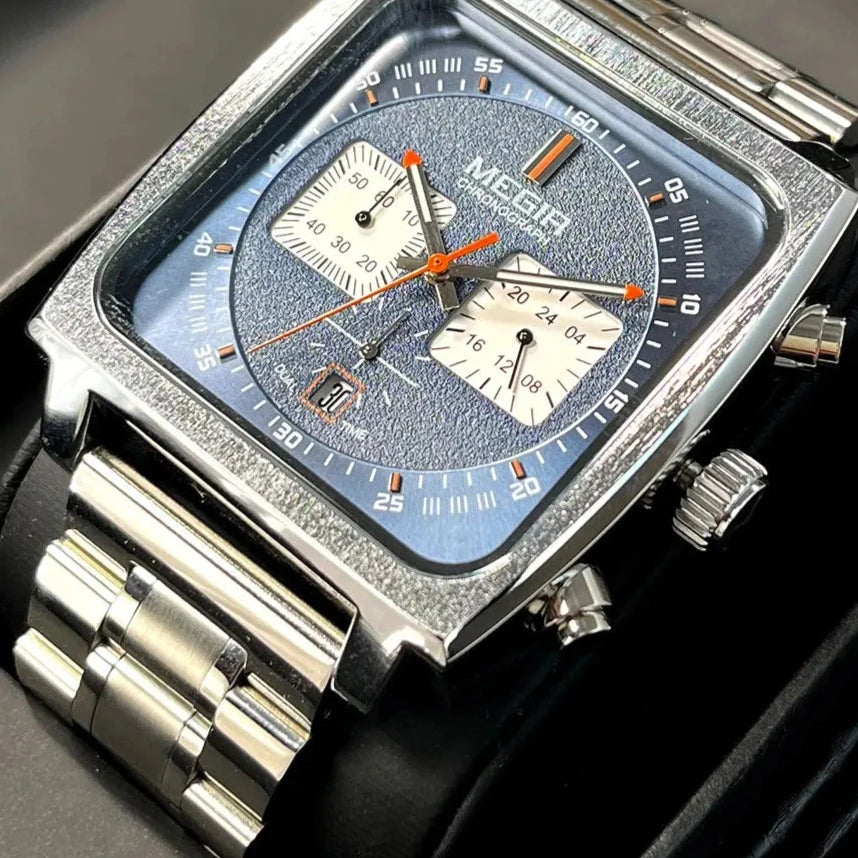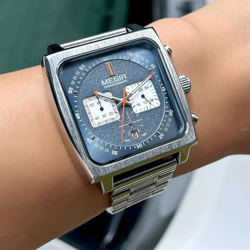 Featuring an eccentric square-shaped dial with a sleek bezel, this watch looks dazzling on the wrist no matter the outfit it’s paired with. On top of that, the luminous analog pointers and multiple subdials present time in a splendid fashion.